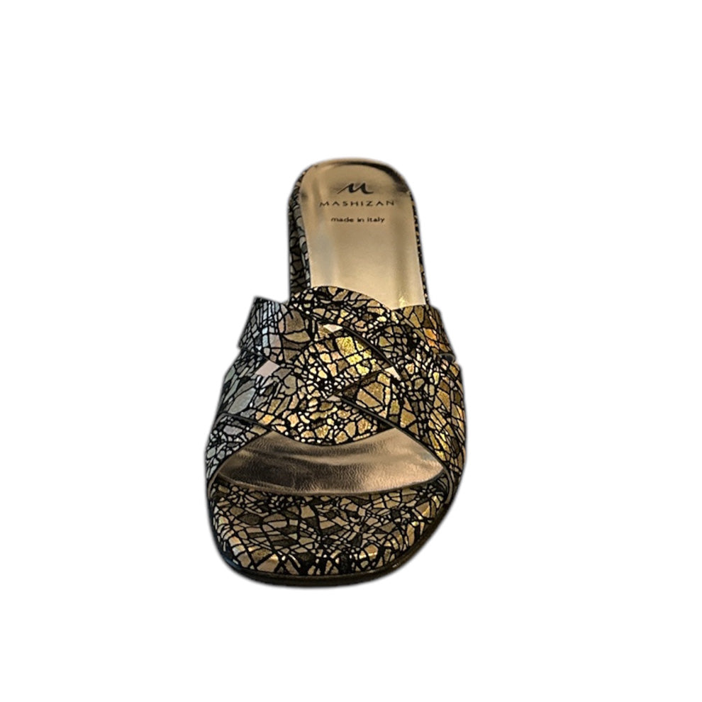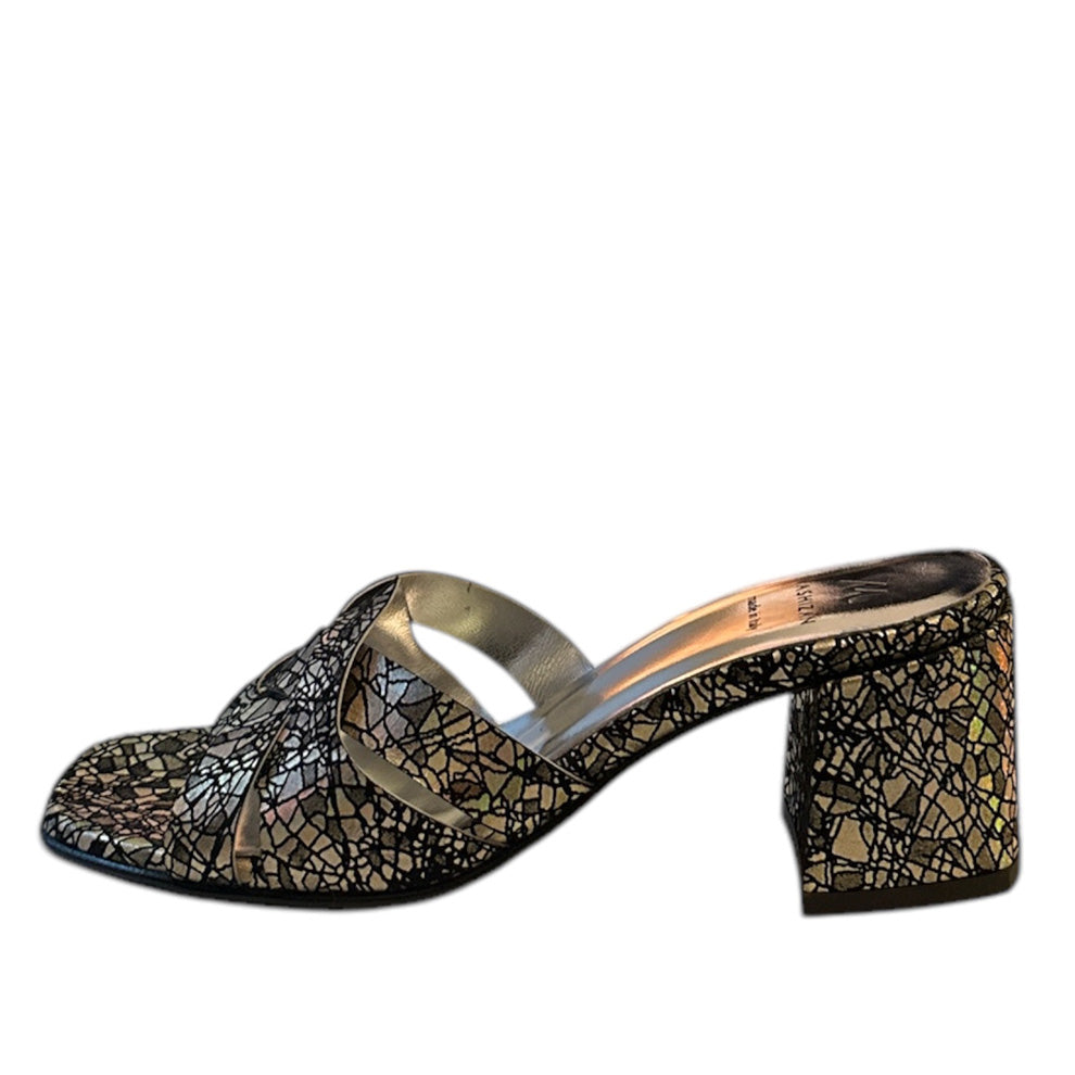 Block heel open-toe sandals. Leather in stained glass effect with a mother-of-pearl iridescent hue