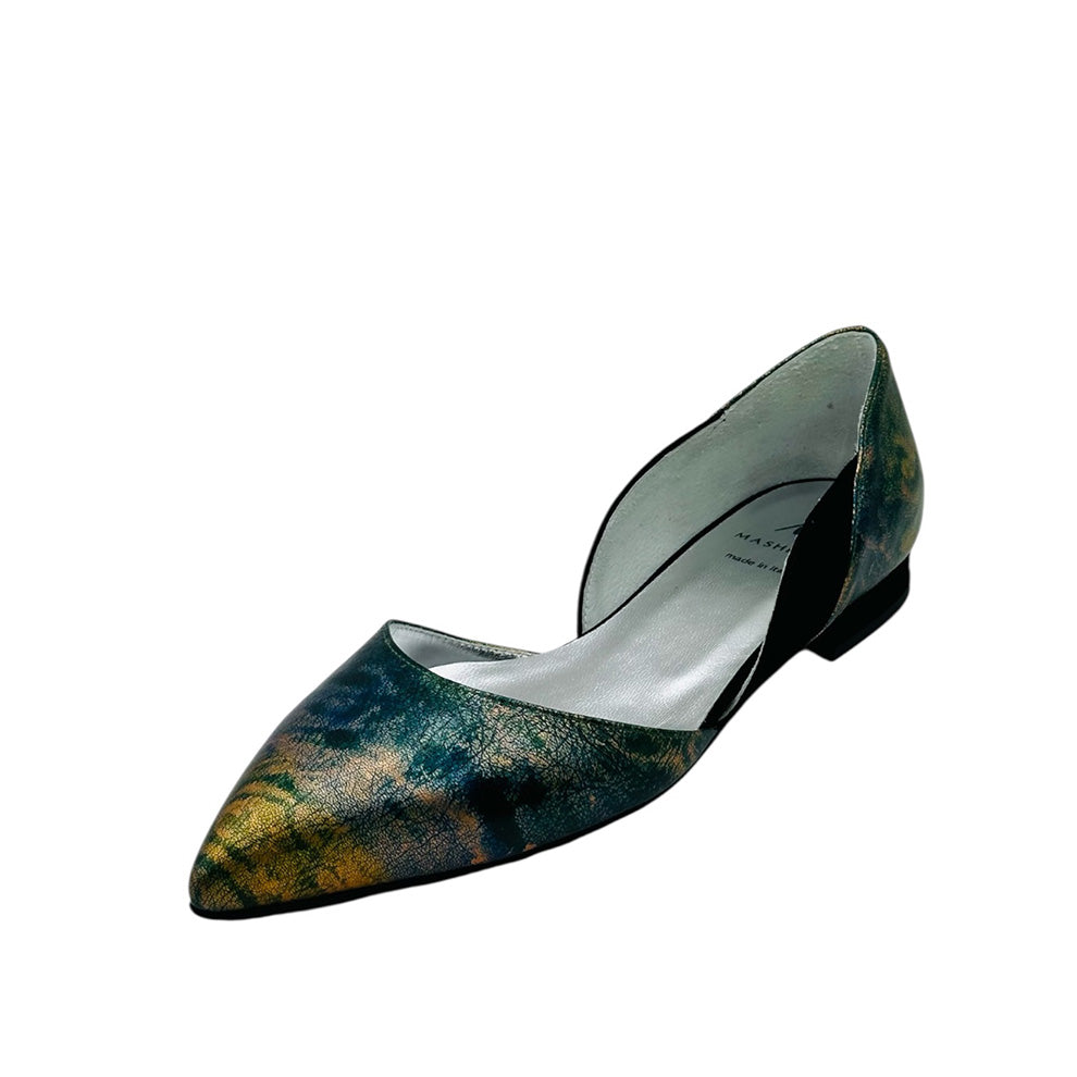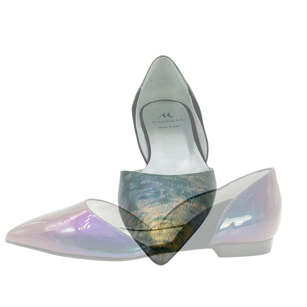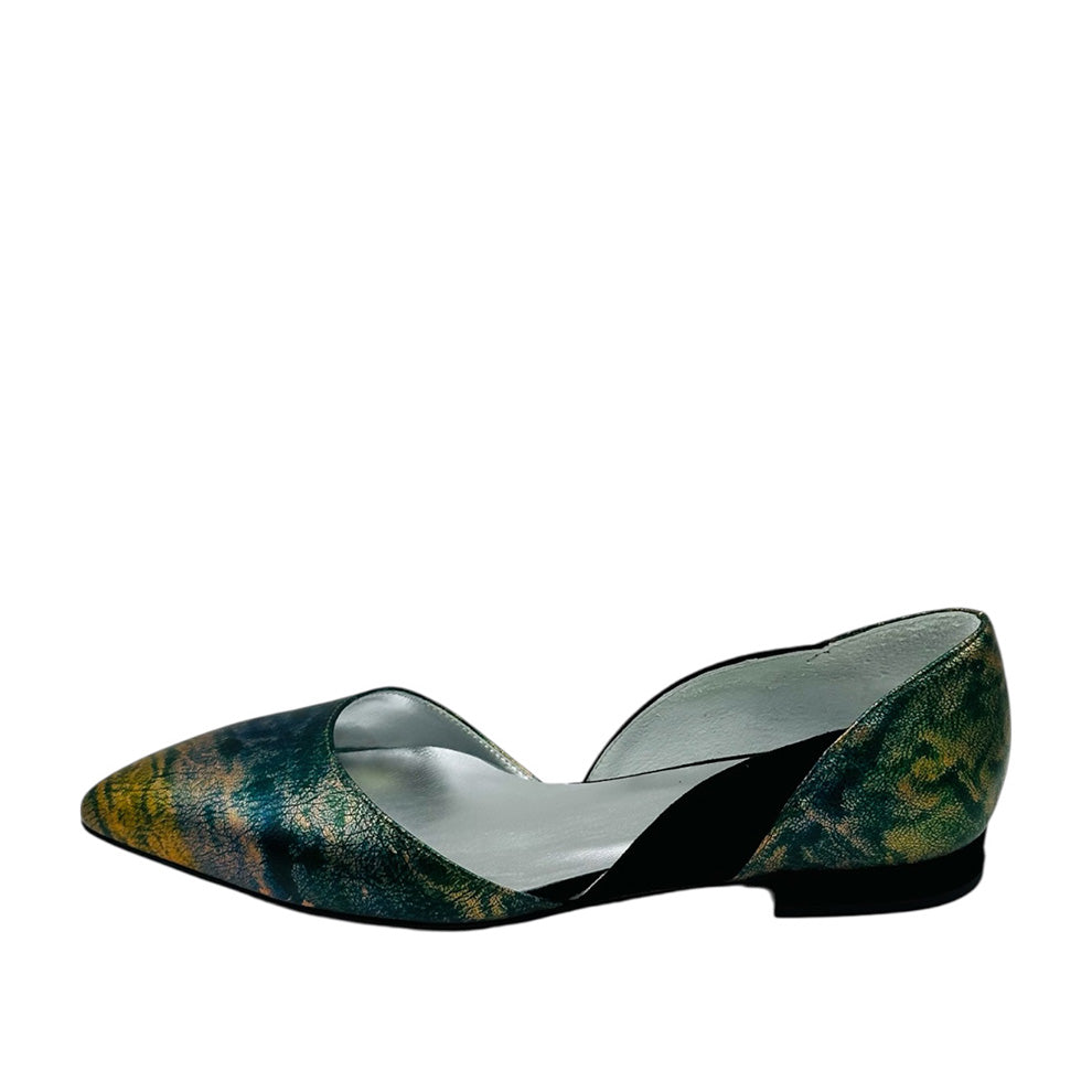 Pointy flats in our signature silhouette. Laminated nappa leather in hues of green and gold